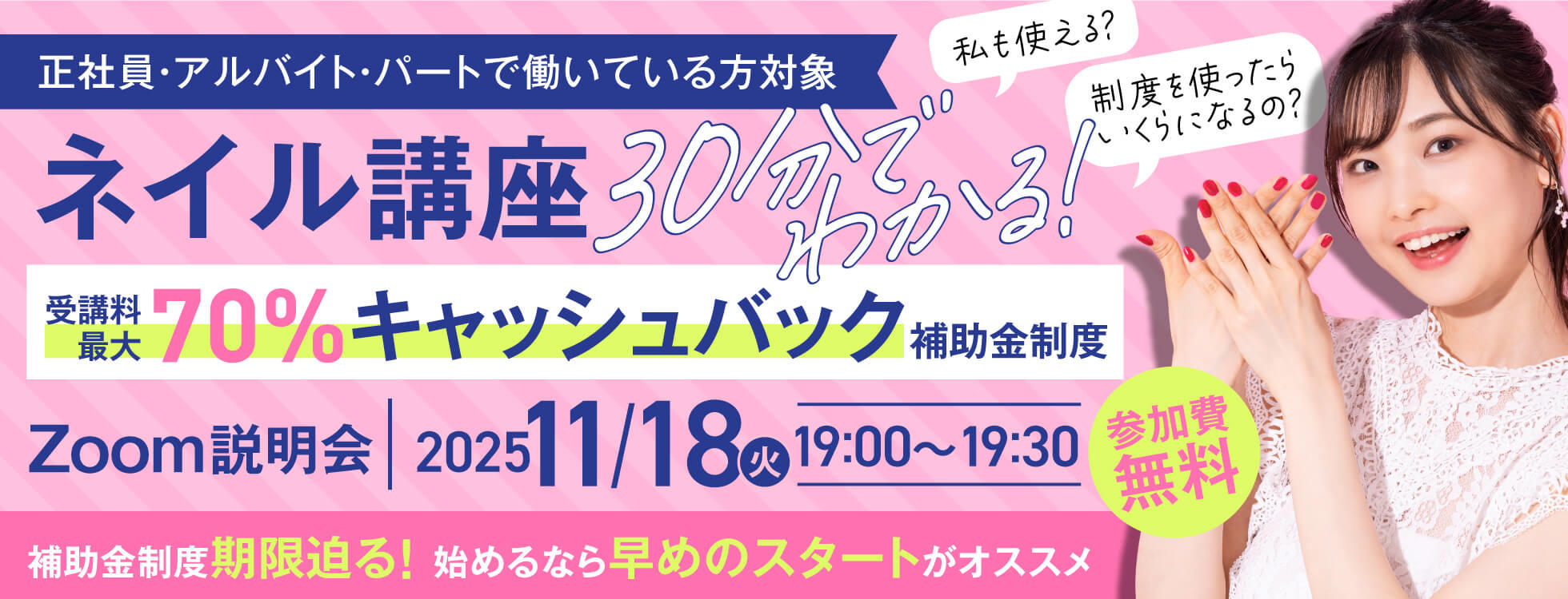 11/18開催\ 30分でわかる/ネイル講座 受講料最大70%キャッシュバック補助金制度!Zoom説明会