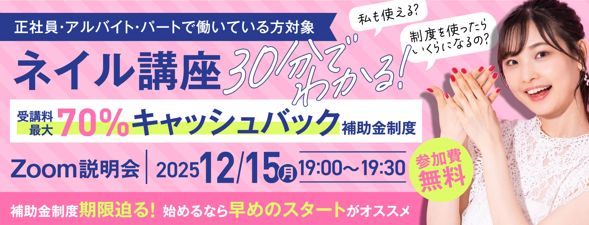 12/15開催\ 30分でわかる/ネイル講座 受講料最大70%キャッシュバック補助金制度!Zoom説明会
