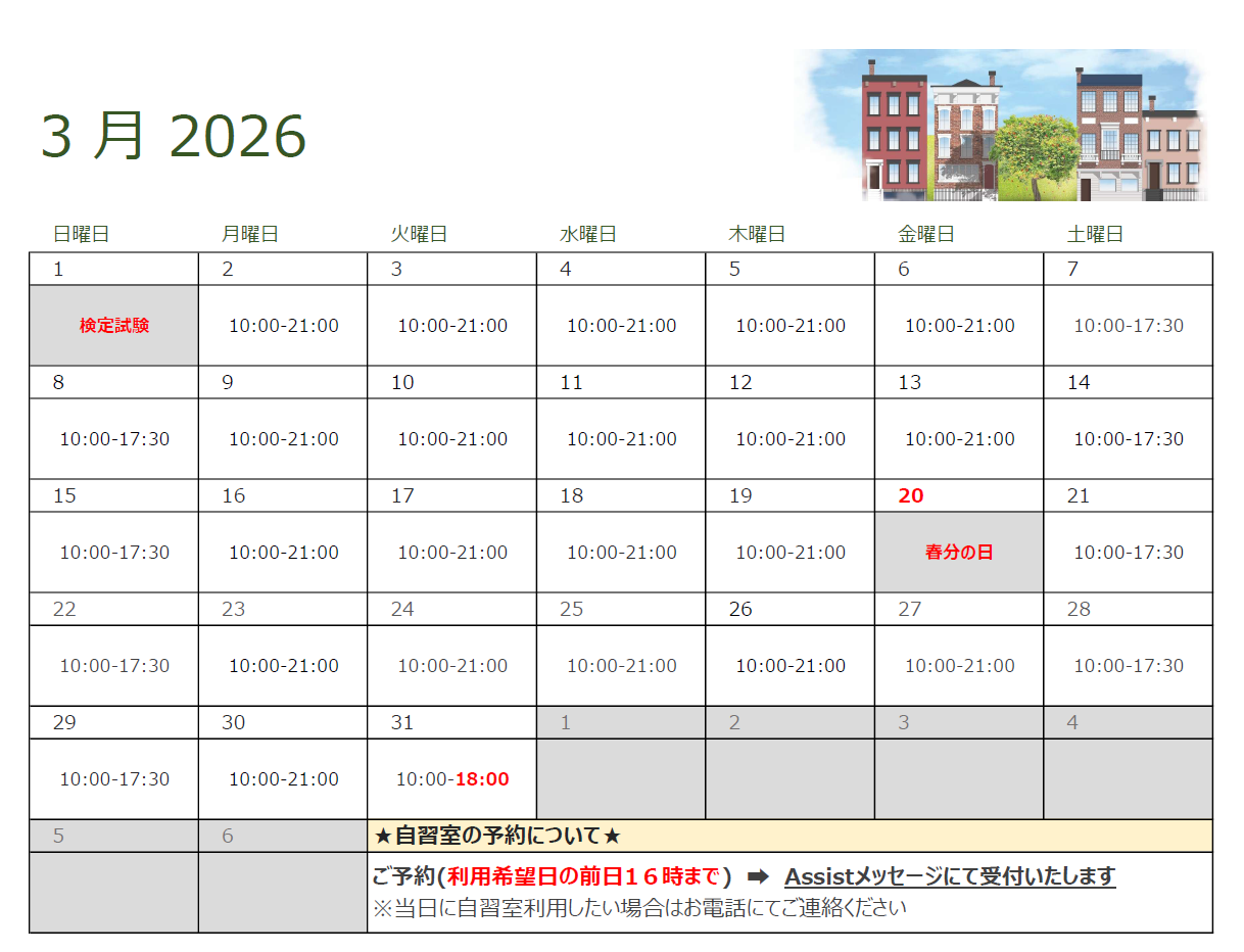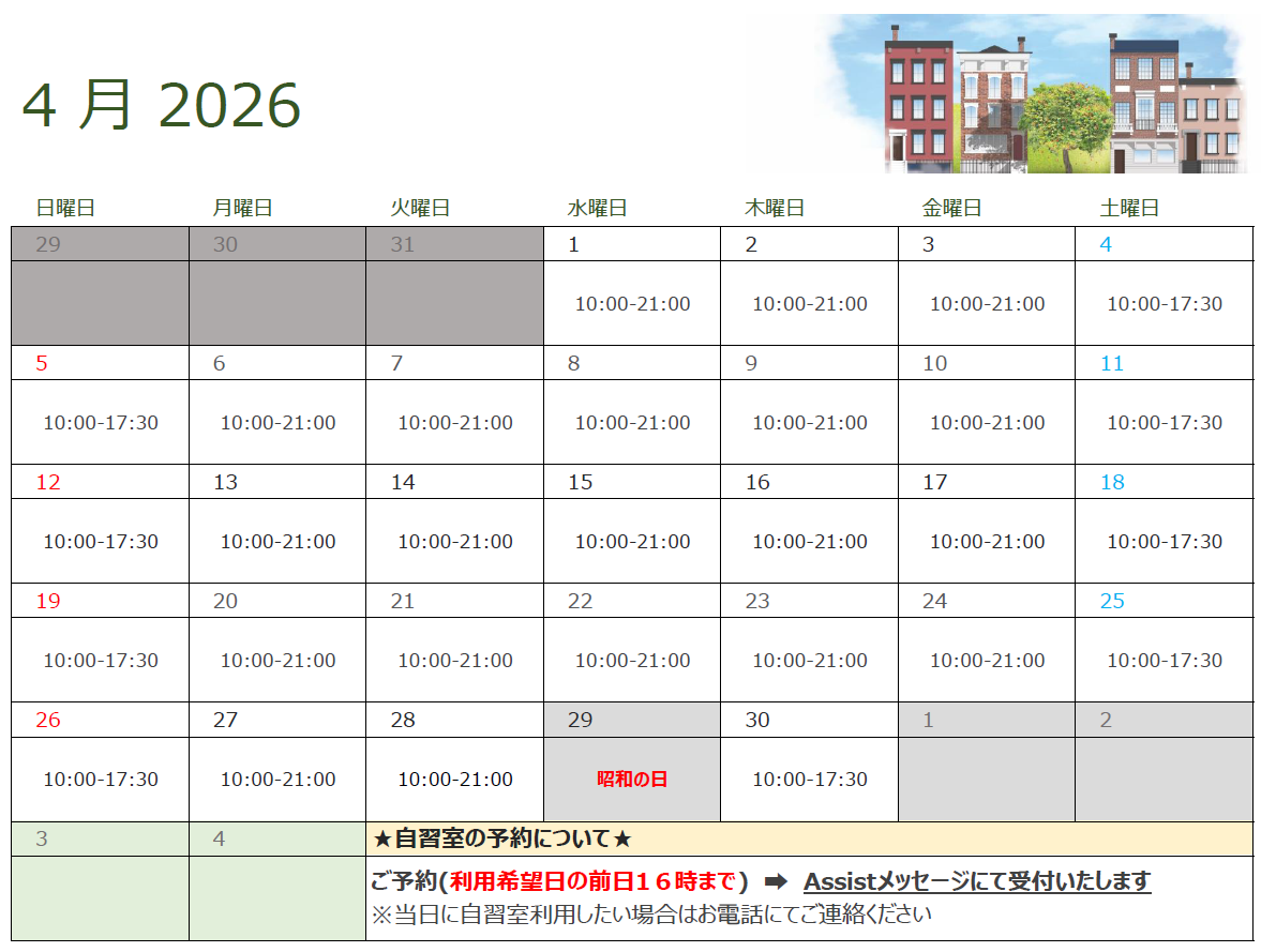 ※このページから自習室予約はできません、Assistメッセージでご予約下さい